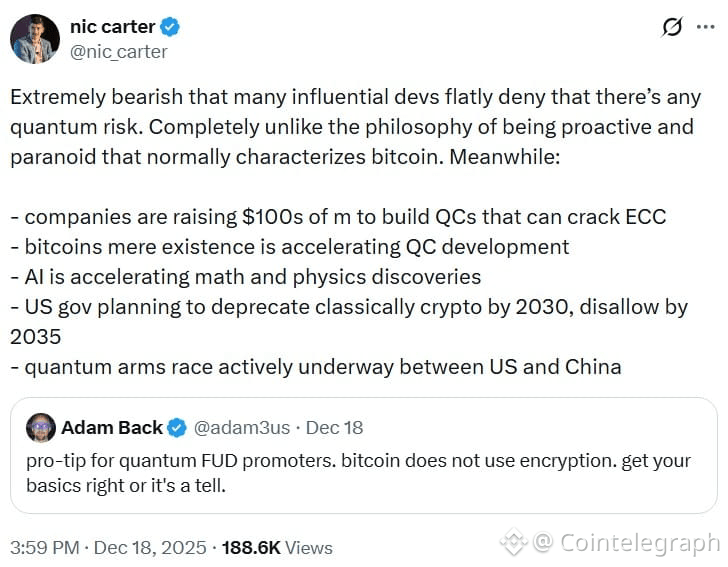 On the other side, investors and researchers argue that even a low-probability outcome matters for an asset whose value depends on long-term confidence. Castle Island Ventures partner Nic Carter has described the outright dismissal of quantum risk by influential developers as bearish.