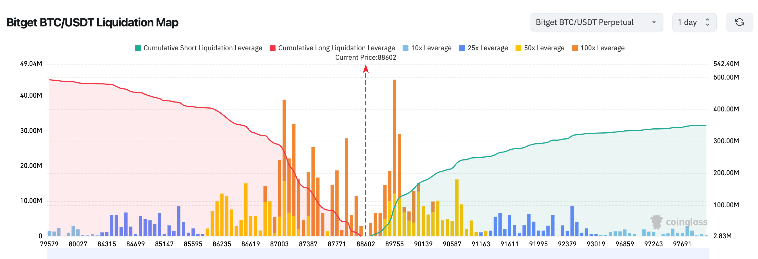 3. Bitget BTC/USDT liquidation map shows: Near the current price level (≈88.6k) is a battleground for bulls and bears: the 89k–90k range has a dense accumulation of 50x–100x long liquidations; if a volume breakout occurs, it could trigger a short squeeze and accelerate upward movement. However, the 84k–86k range has weak short liquidations and support; the bullish position is crowded, and if the price fails to rise and falls back, one must be wary of rapid retracement and hunting of long positions after false breakouts.