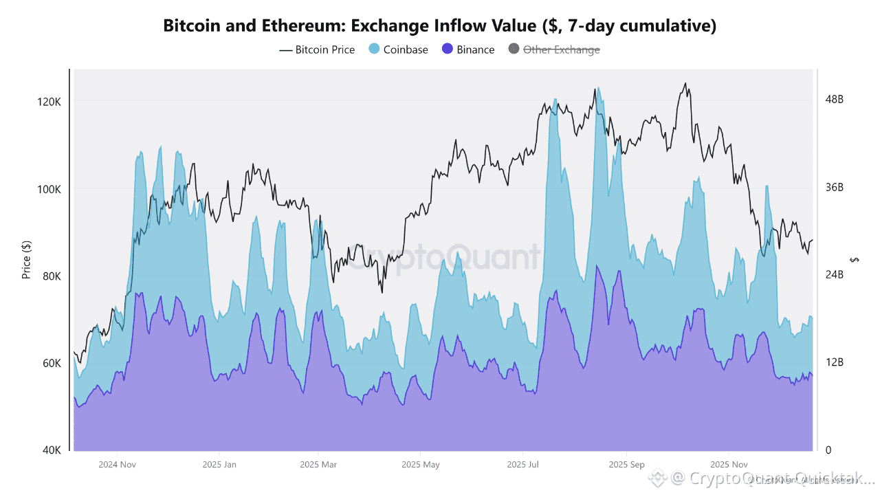 On November 24, Bitcoin was priced at $88,438. At that time, Coinbase recorded seven-day cumulative inflows of $21.026 billion, while Binance saw inflows of approximately $15.279 billion. These figures reflect a relatively high level of liquidity entering exchanges, despite prices trading at lower levels compared to earlier periods. This suggests notable activity related to repositioning or transferring assets to exchanges during that time.