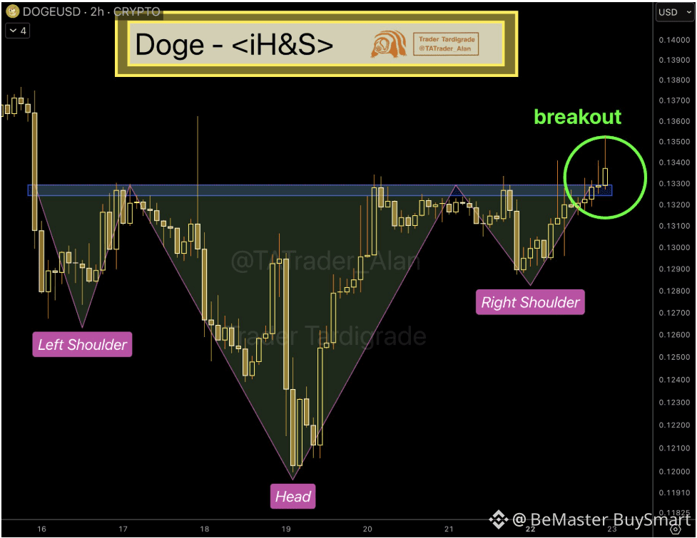 ✨ Dogecoin just pushed through a key resistance level that's been holding it back for weeks. On the 2-hour chart, price finally climbed above the $0.132–$0.133 zone, breaking free from what had become a stubborn ceiling. What makes this move interesting is the clean inverse head and shoulders pattern that formed along the way—a left shoulder that appeared first, a deeper dip down to around $0.119–$0.120 for the head, and then a right shoulder that came in higher than the left one as buyers started stepping back in.
