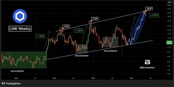 LINK continues trading inside a clearly defined ascending parallel channel on the weekly chart. According to commentary shared by Bitcoinsensus, price has consistently respected both channel boundaries. This pattern reflects orderly participation rather than disorderly selling pressure. The structure remains intact without any decisive weekly breakdowns.