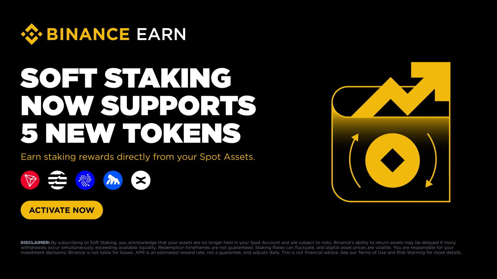 Binance is pleased to announce that Soft Staking now supports five new tokens: Tron (TRX), Aptos (APT), IOTA (IOTA), ApeCoin (APE), and MultiversX (EGLD). Soft Staking allows users to earn staking rewards on selected tokens from their Spot Accounts, which can be simply activated with one click. Soft Staking offers full flexibility—users can trade, withdraw, or use their tokens anytime while earning rewards on their Spot assets.