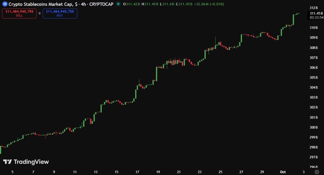 El valor total de las stablecoins acaba de superar los $311.45 mil millones. Sí, lo leíste bien: trescientos once mil millones de dólares. Esto no es solo otro número para pasar por alto. Este es el más alto que ha sido, y honestamente, he estado observando este espacio durante años, y esto me emociona genuinamente.