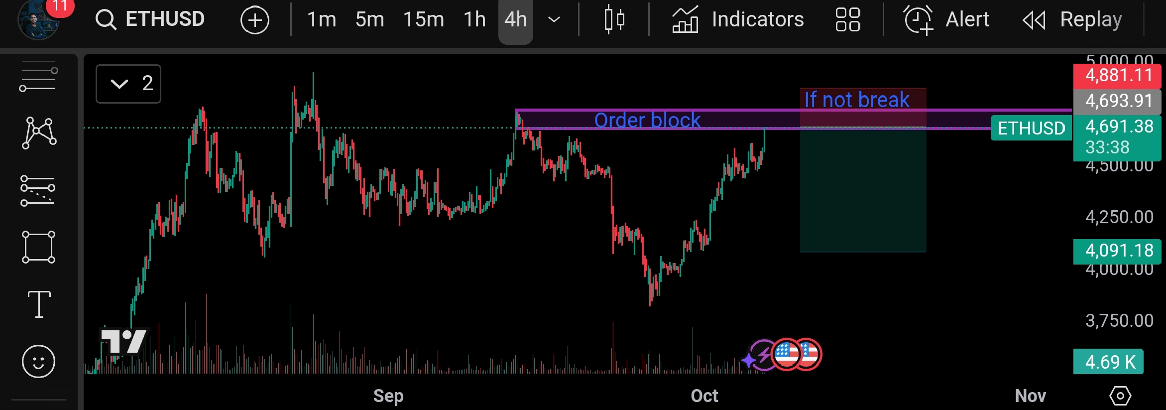 $ETH actualmente está probando un área de resistencia de bloque de órdenes importante (alrededor de 4690–4880).