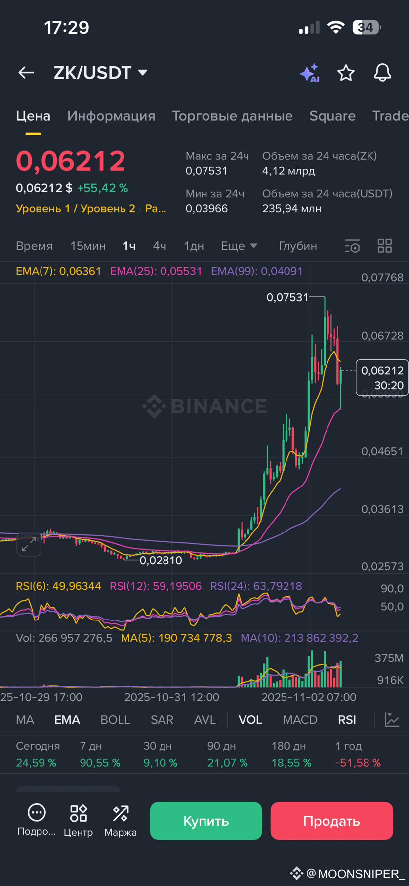Всем привет! Сегодня в фокусе — $ZK, который продемонстрировал взрывной рост на +55% за сутки. Давайте разберем, что происходит с монетой и куда она может двигаться дальше.
