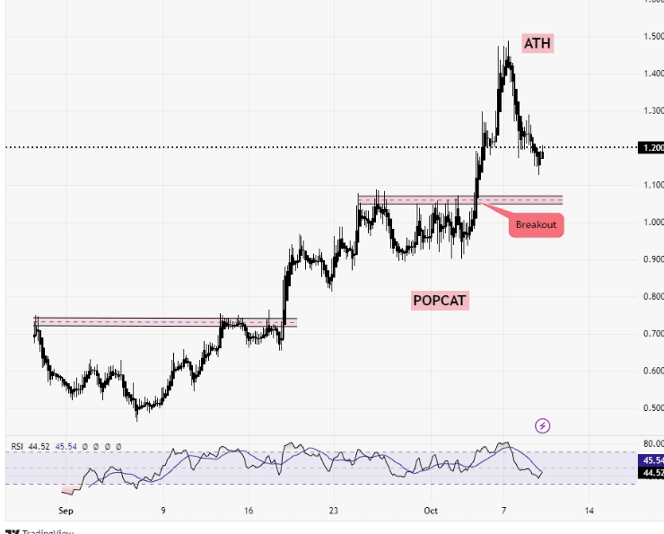 El 4 de octubre, POPCAT rompió su nivel de resistencia de $1.07 y alcanzó un nuevo máximo histórico de $1.4876. Esto marcó un impresionante aumento del 40%. Sin embargo, después de alcanzar este pico, POPCAT experimentó una corrección y cayó casi un 20% hasta su precio actual de $1.20.