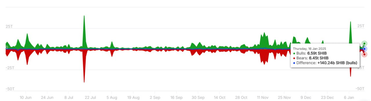 El jueves 16 de enero, el volumen total de operaciones alcanzó un impresionante 13.04 billones de SHIB, valorados en $313 millones. Los toros tomaron la delantera, representando 140.24 mil millones de SHIB, valorados en $3.4 millones.
