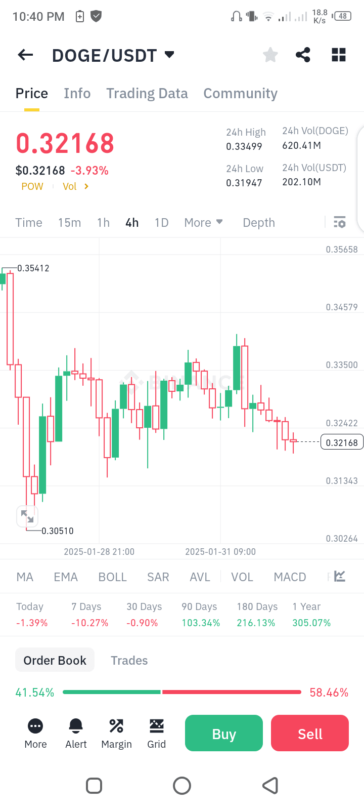 1. Movimiento del Precio: El precio actual de $DOGE /USDT es 0.32168, mostrando una disminución del 3.93%. El precio ha estado fluctuando dentro de un rango, indicando una posible consolidación.