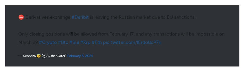 Debido a las sanciones de la UE contra Rusia, Deribit ya no puede aceptar a ciudadanos rusos y residentes rusos como sus clientes, a menos que se aplique una excepción. Dado que la empresa matriz de Deribit es holandesa, estas sanciones de la UE son relevantes para nosotros”, señaló el intercambio de criptomonedas.