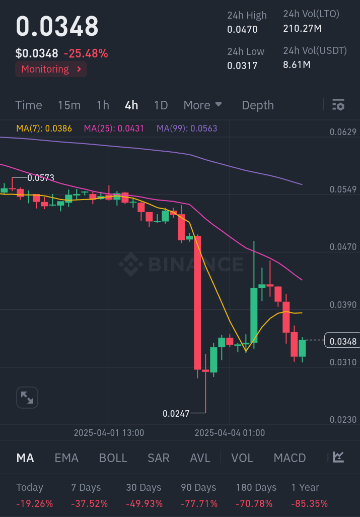 LTO se está negociando alrededor de $0.0348, después de haber tenido una fuerte caída de más del 25% en un día. Para muchos, esto parece una bandera roja. Pero para el ojo experimentado? Este es el tipo de punto de entrada por el que los inversores experimentados rezan. Aquí es donde se hace dinero real.