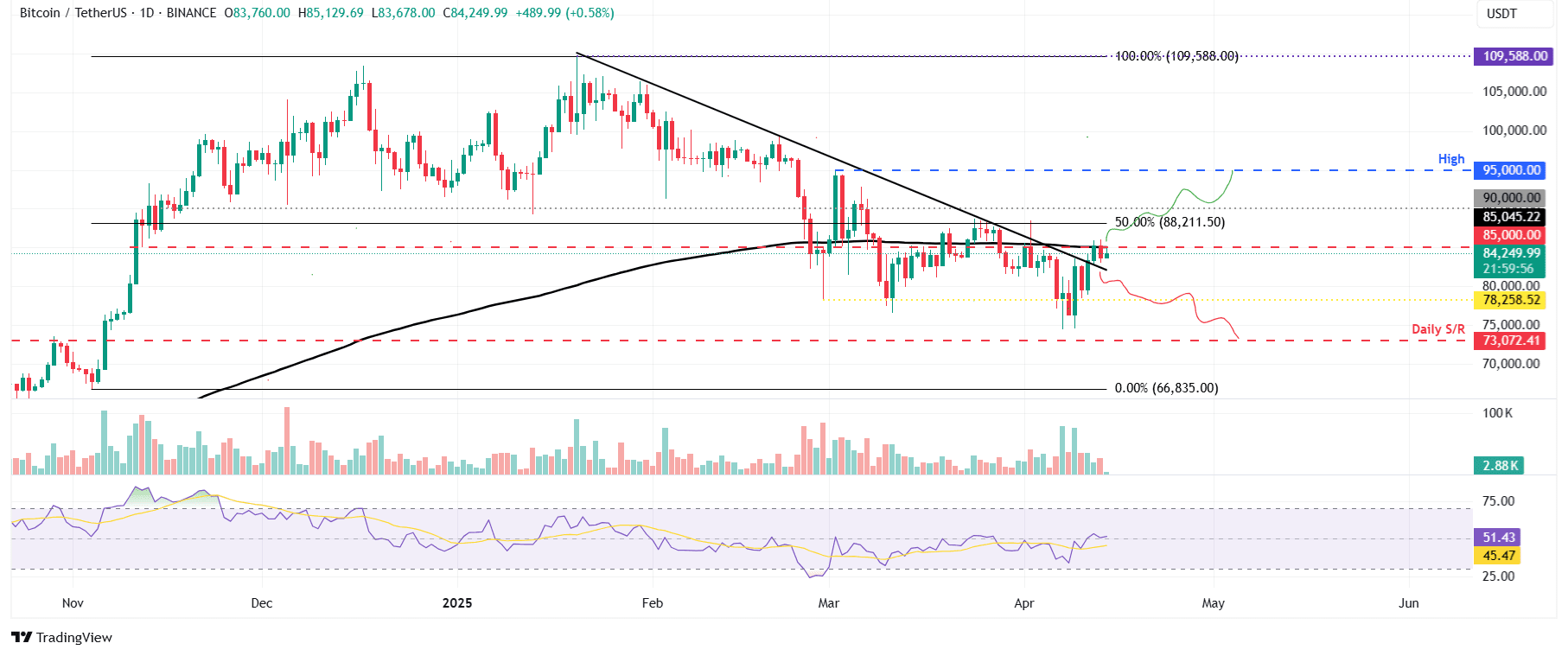 Si BTC rompe y cierra por encima de $85,000, podría extender el rally al nivel psicológico clave de $90,000. Un cierre exitoso por encima de este nivel podría extender un rally adicional para probar su máximo del 2 de marzo de $95,000.