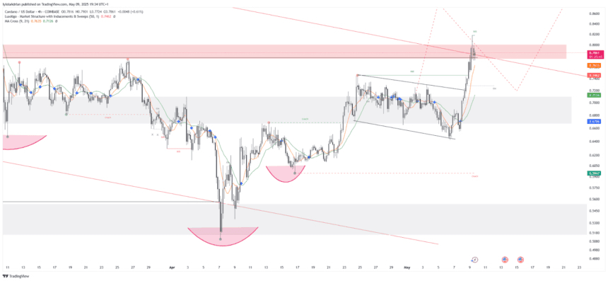 El precio de Cardano está subiendo lentamente hacia su objetivo esperado de $1, sin embargo, necesita romper por encima de su zona de resistencia actual para continuar el rally. Mientras tanto, ADA alcanzó un máximo de $0.80 hoy. Si este cruce dorado se desarrolla como se supone que debe, ADA podría estar preparándose para una carrera real.