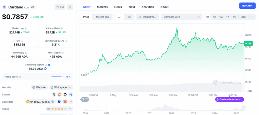 El precio de Cardano (ADA) ha mostrado un cruce dorado en el gráfico horario y esto a menudo es una señal de que se avecina una tendencia alcista. Esto ocurrió cuando la media móvil a corto plazo cruzó por encima de la media móvil a largo plazo. Al momento de escribir, ADA se cotiza a $0.7857, un aumento del 7%, después de haber subido desde un mínimo de $0.72 hasta $0.7923. El volumen de comercio casi se duplicó en el mismo período, aumentando casi un 99% hasta $1.78 mil millones.