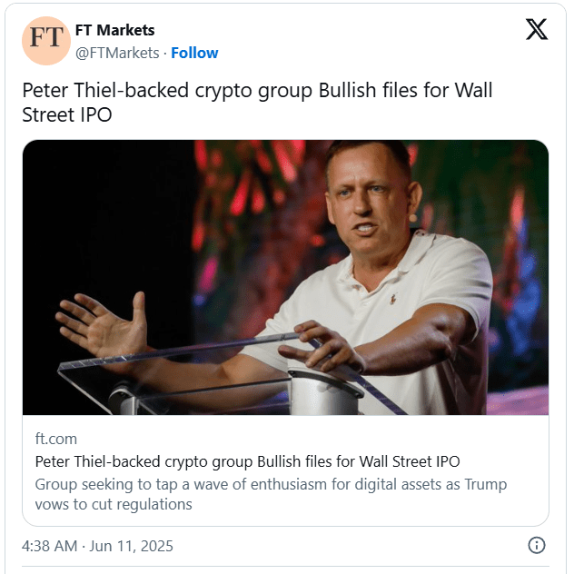 Bullish, la bolsa respaldada por el inversionista multimillonario Peter Thiel, ha presentado de manera confidencial una oferta pública inicial (IPO) en EE. UU., con el objetivo de capitalizar el creciente apetito de los inversionistas por los activos digitales en un clima político cada vez más favorable.