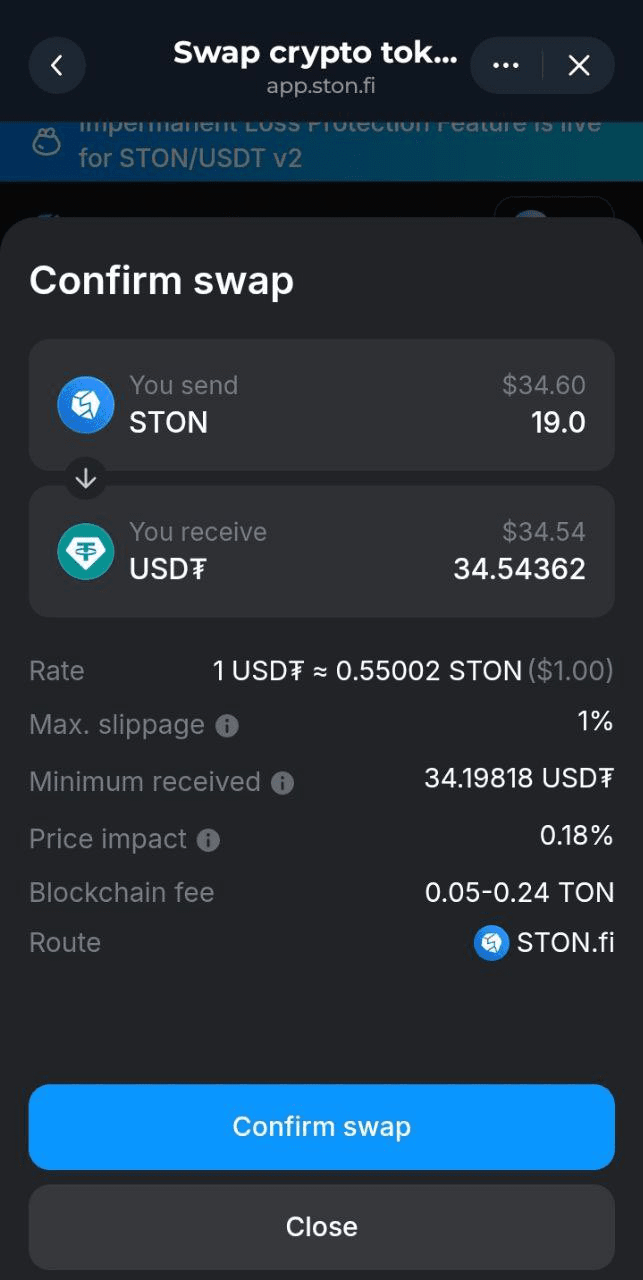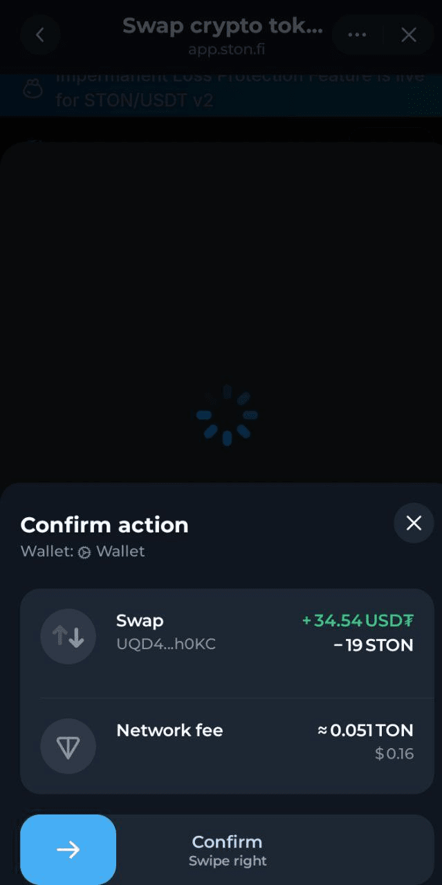 Paso 6: Confirma el intercambio. Gracias a la velocidad de la blockchain de TON y al diseño de Stonfi, tu transacción se completará en segundos.