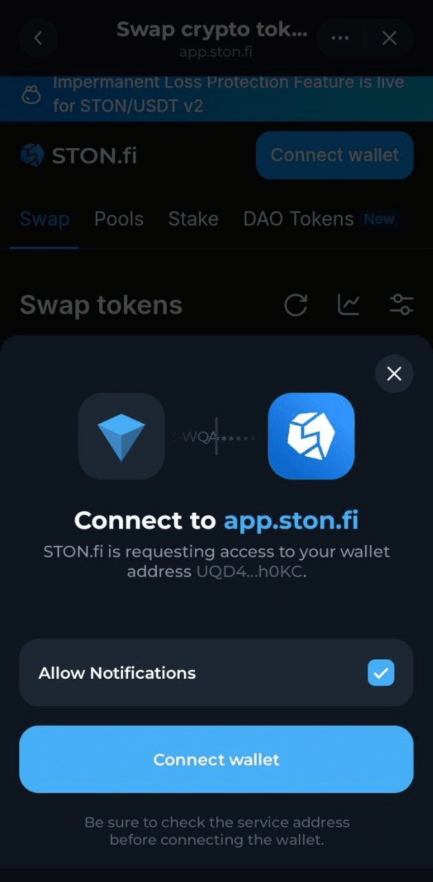 Paso 1: Conecta tu billetera compatible con TON (como Tonkeeper) a Stonfi a través de app.ston.fi. Asegúrate de tener algunos tokens TON para cubrir las tarifas de transacción.
