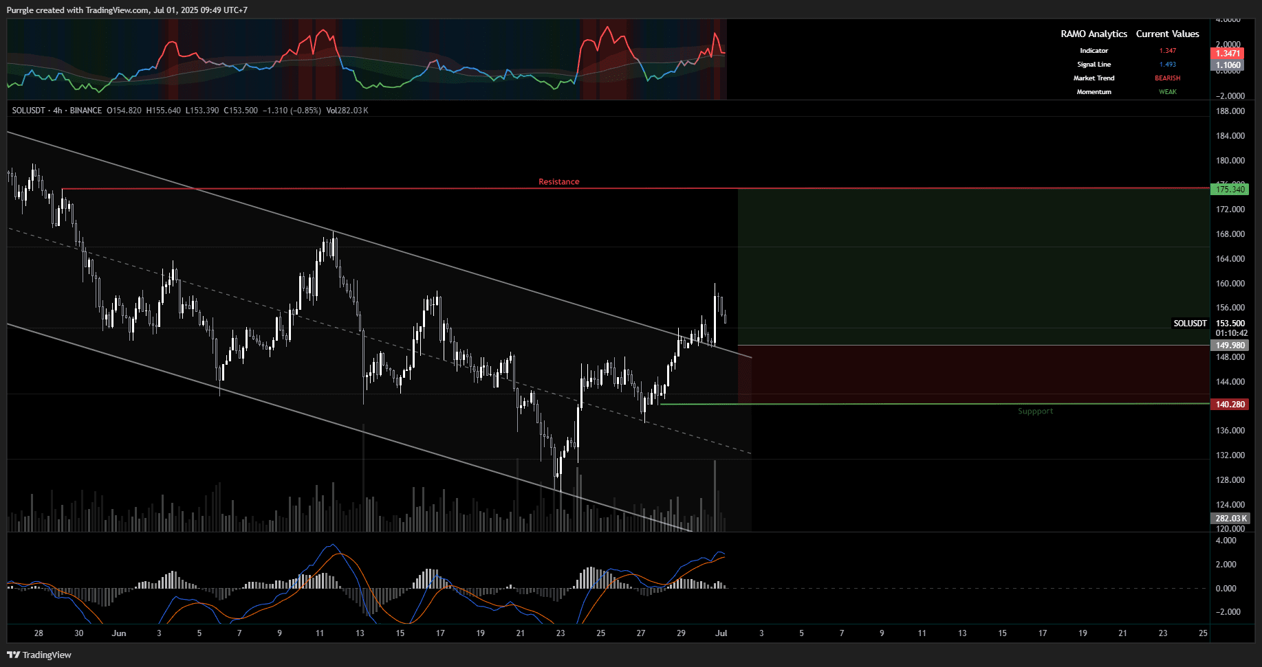 Después de más de 50 días en una tendencia bajista, SOL está mostrando signos de ruptura. El reciente intento de ruptura por encima de la línea de tendencia sugiere que el momentum puede estar cambiando a favor de los toros. Si SOL puede mantenerse por encima del nivel de ruptura, hay potencial para un fuerte movimiento al alza. Los traders de momentum deben estar atentos a un volumen sostenido y velas de confirmación antes de entrar.