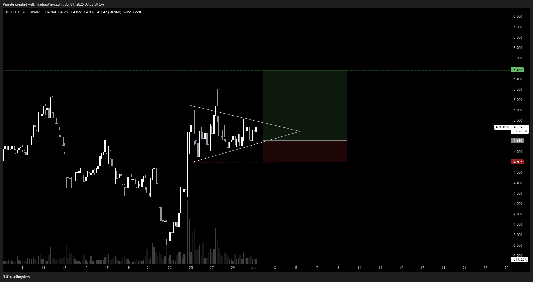 APT está formando un triángulo simétrico en el marco de tiempo de 4H, a menudo visto antes de una ruptura. Este tipo de patrón refleja la indecisión del mercado, y una vez que se confirme una dirección, generalmente sigue un movimiento significativo. Si APT rompe por encima de la línea de tendencia superior con un volumen fuerte, podría señalar una continuación alcista. Usa precaución hasta que la confirmación sea clara.