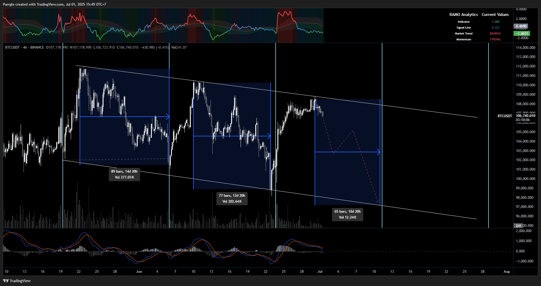 En la última instancia, BTC tocó $108,500 el 30 de junio de 2025. Si el patrón continúa, podríamos ver una corrección notable ocurriendo hasta el 11 de julio, arrastrando potencialmente a BTC hacia el nivel de $97,000.