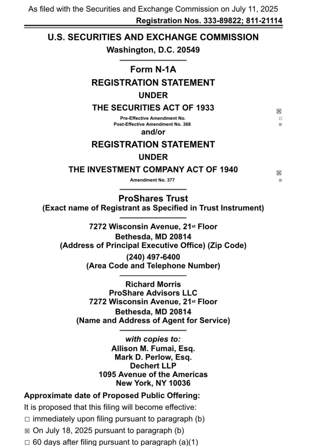 El gestor de activos ProShares ha establecido oficialmente el 18 de julio de 2025 como la fecha efectiva para su ETF de XRP, tras una enmienda presentada bajo la Regla 485(b)(1)(iii). El fondo había aparecido anteriormente en la plataforma DTCC. Esto señala la preparación para unirse a una lista creciente de productos cotizados en bolsa basados en cripto.