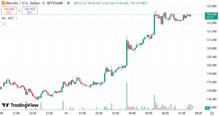 En un desarrollo sorprendente, el precio de BTC alcanzó los $119,292 ayer, marcando un nuevo máximo histórico. Despertando aún más interés, Bitcoin ha continuado su rally alcista, alcanzando ahora otro nuevo máximo histórico de $122.2K. Como informamos, por qué Bitcoin está subiendo, está impulsado por una combinación de factores, incluyendo los aranceles de Trump, el sólido rendimiento de ETF, y una acumulación sustancial por parte de Bitcoin empresas tesoreras.