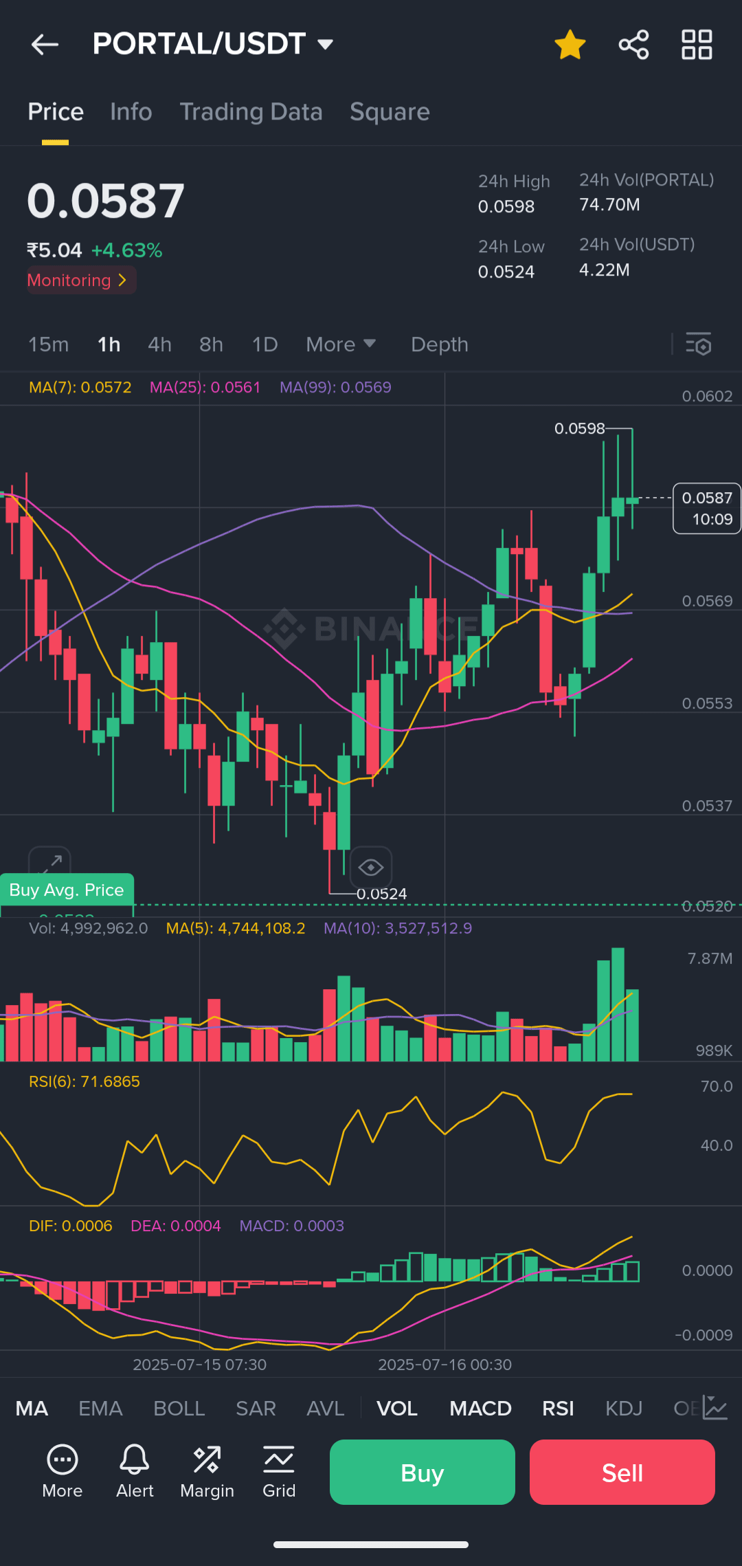 Parece que has subido una captura de pantalla del par de trading PORTAL/USDT en Binance, mostrando un gráfico de velas con varios indicadores (MA, RSI, MACD). El precio en el momento de la captura de pantalla era 0.0587 USDT, un aumento del +4.63%.