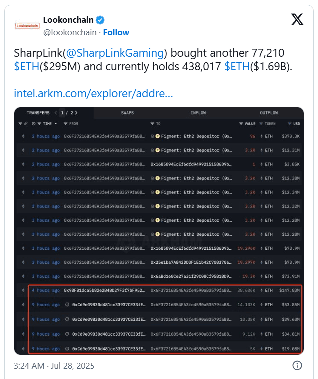 SharpLink actualmente posee 438,017 ETH $ETH , valorados en $1.69 mil millones, según Lookonchain.