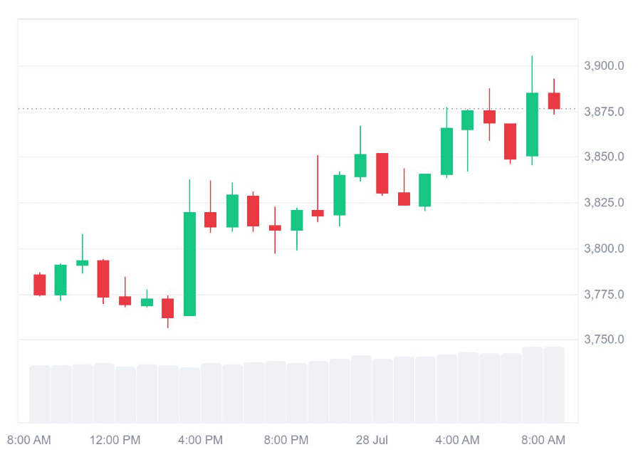 Como resultado, Ethereum continúa mostrando resiliencia en medio de la volatilidad del mercado más amplio. La segunda criptomoneda más grande ha subido un 3% el lunes, cotizando a $3,876 durante el tiempo de prensa. Según CoinMarketCap, el aumento refleja técnicos alcistas, acumulación institucional y dinámicas de staking.