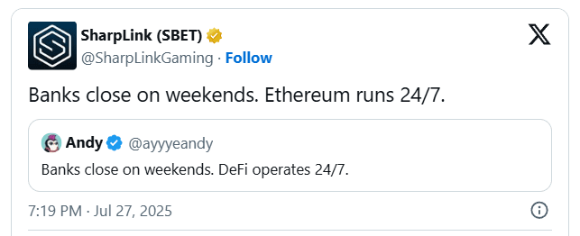 SharpLink planea depositar el ETH en staking, señaló el analista en cadena EmberCN. La empresa dijo el domingo que los bancos cierran los fines de semana, mientras que Ethereum opera 24/7, destacando la próxima gran compra de ETH.