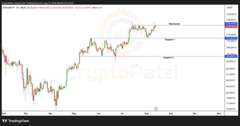 Notablemente, Bitcoin registró un máximo histórico de $123,000 el 14 de julio después de recuperarse de un movimiento importante por debajo de $100,000 en junio. Sin embargo, tras la resistencia en $123K, BTC cayó a $111,943 el 3 de agosto antes de asentarse en su precio actual. La zona de $120K ha limitado los avances de precios desde finales de julio. Múltiples velas diarias han tocado o se han acercado al nivel entre julio y agosto sin cerrar por encima de él.