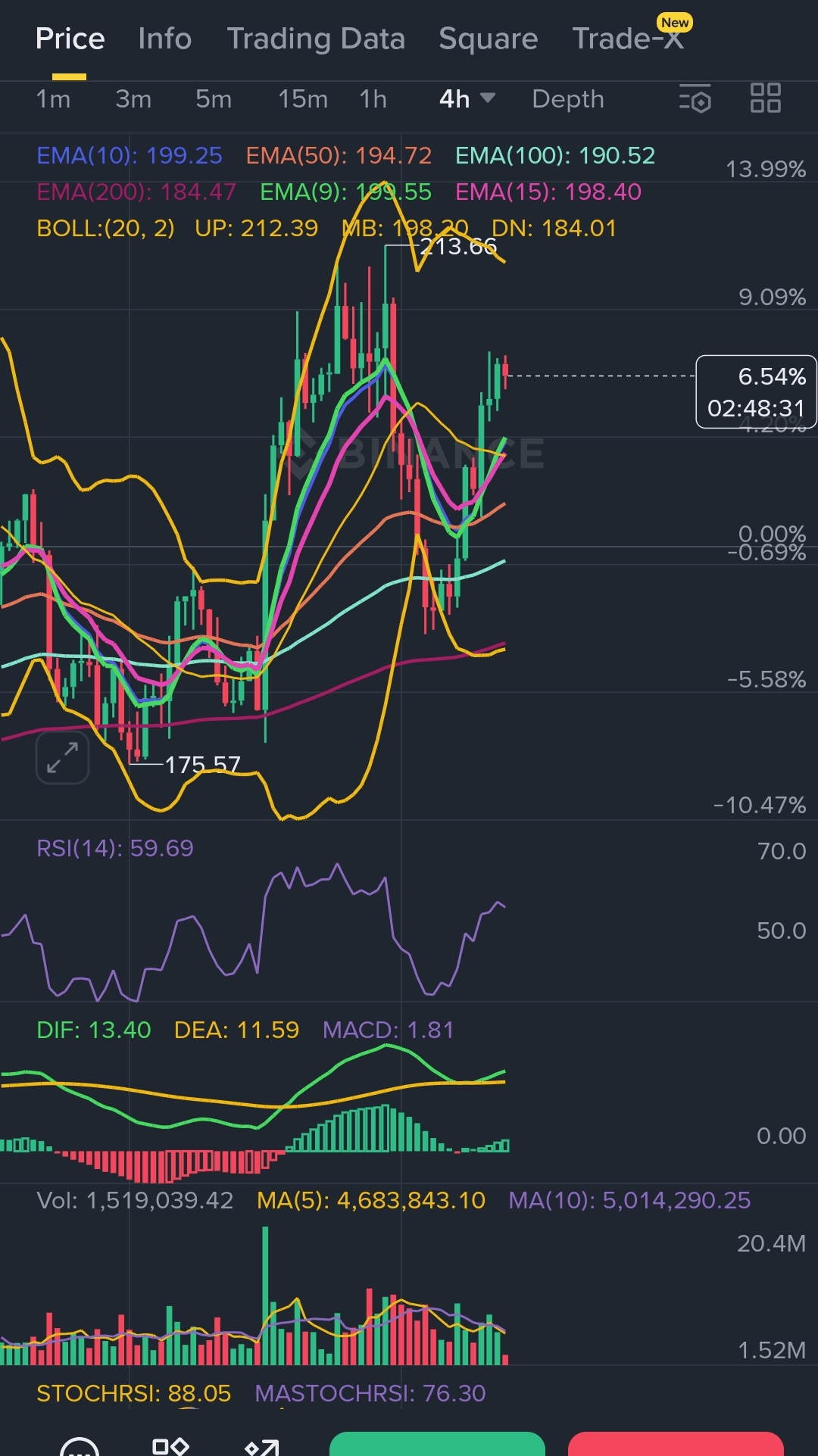 · El precio ($204) está negociando **MUY POR ENCIMA** de todas las EMAs clave (10, 50, 100, 200). La EMA(10) cerca de $195 es el primer soporte importante.