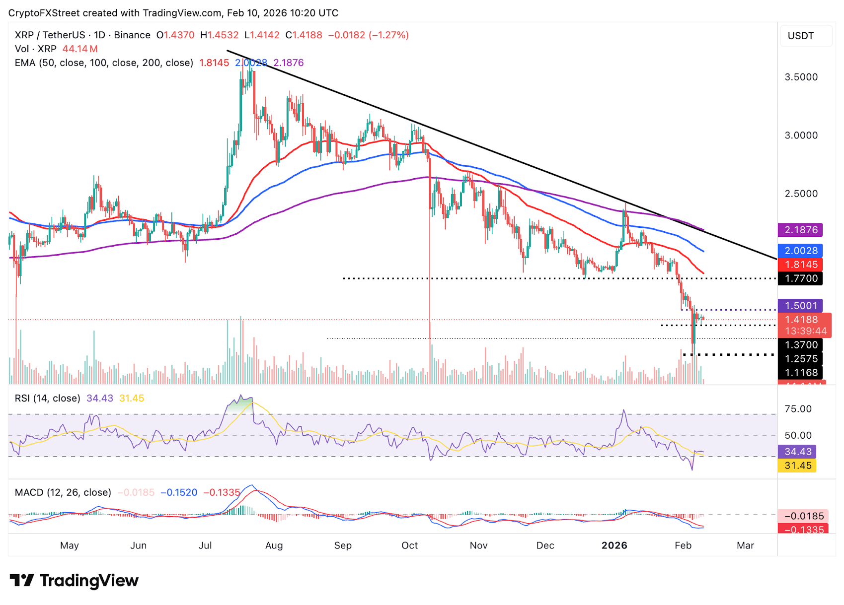 XRP, por otro lado, se mantiene por encima del soporte en $1.40 con una resistencia inicial en $1.50. El camino con menor resistencia sigue siendo hacia abajo, como refleja el RSI por debajo de 35 en el gráfico diario.