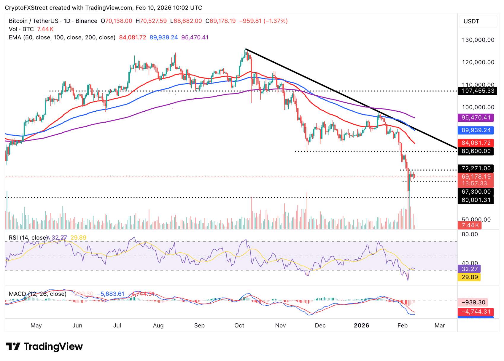 Según el Índice de Fuerza Relativa (RSI) en el mismo gráfico, en 32, el momentum bajista sigue siendo evidente, y las caídas pueden extenderse a corto plazo a menos que el RSI se recupere hacia la línea media. Un retorno para probar el soporte en $67,300 está en las cartas, mientras que el máximo del domingo de $72,271 aún está al alcance si los toros pueden recuperar el nivel de $70,000.