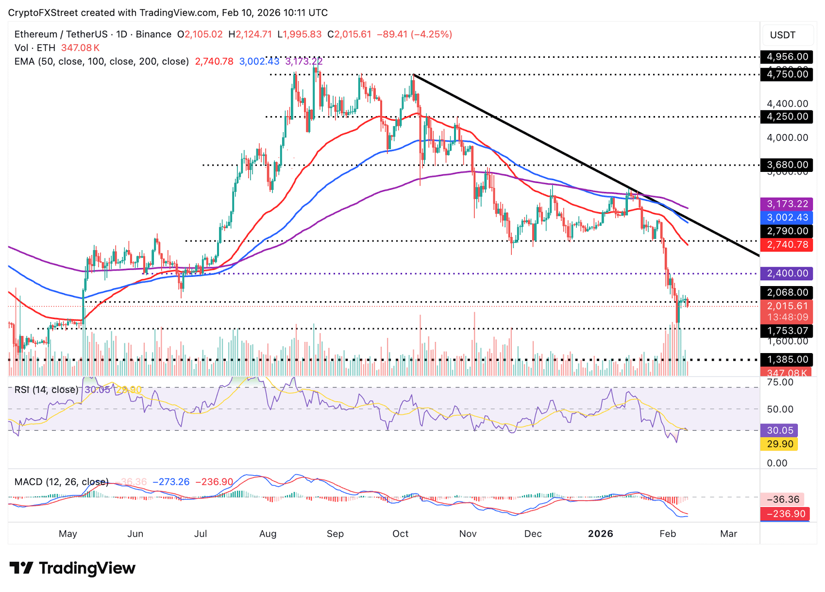 Ethereum se mantiene por encima de $2,000 como soporte inmediato, pero su imagen técnica a corto plazo se deteriora. Los indicadores técnicos, incluido el RSI en 30 y bajando en el gráfico diario, confirman una acumulación continua de momentum bajista.