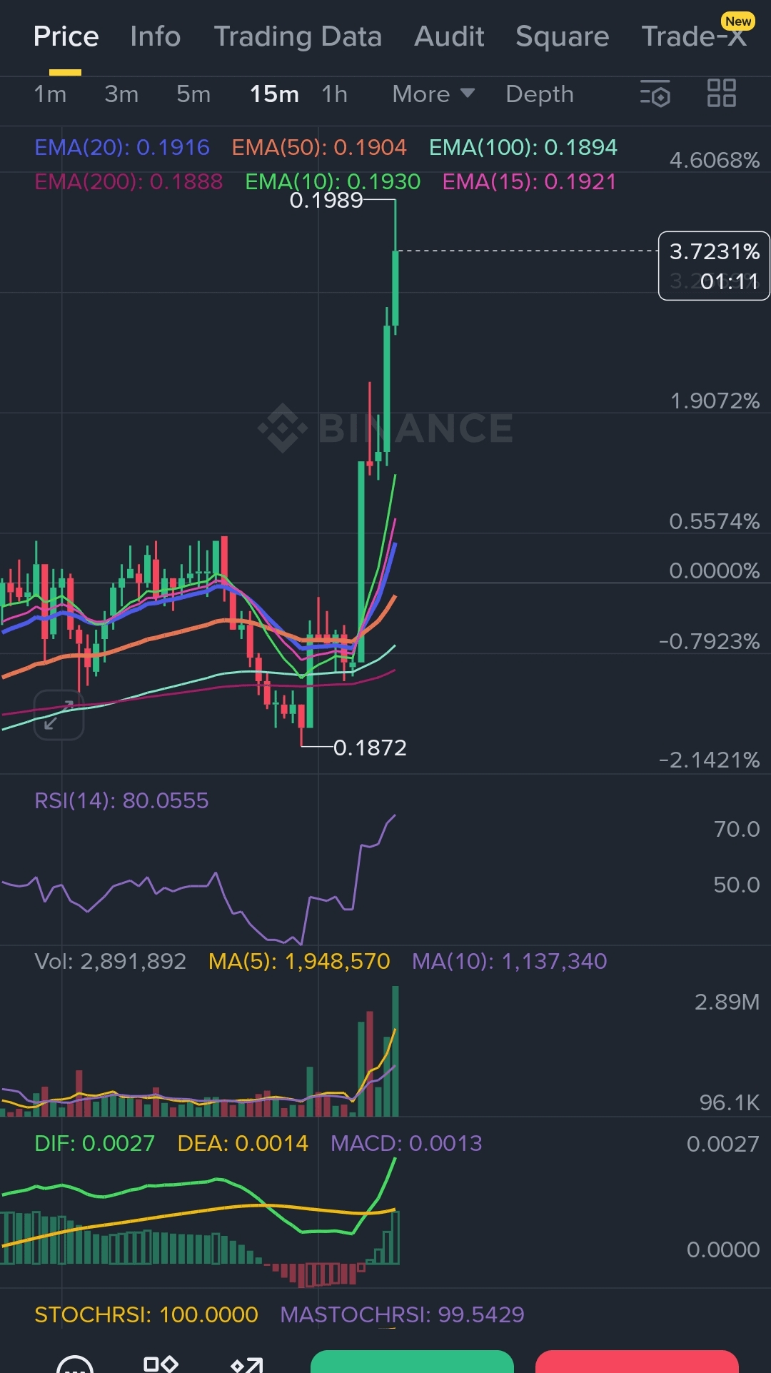 · Libro de Órdenes (Profundidad): El libro de órdenes muestra un soporte de oferta significativo acumulado hasta 0.190 (más de 427K monedas), creando un fuerte suelo de soporte. El lado de la oferta tiene paredes más delgadas, lo que sugiere que una ruptura podría moverse rápidamente.