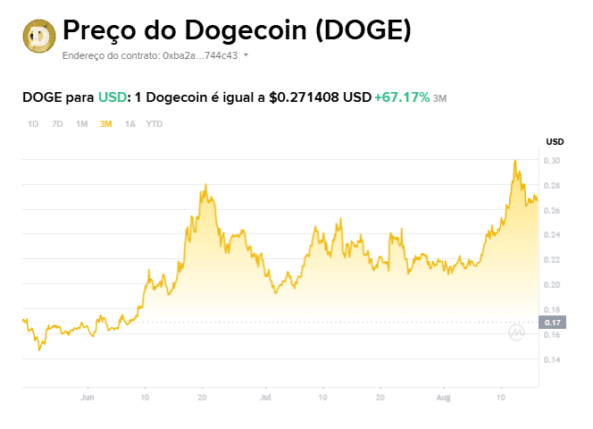 Actualmente, el Dogecoin se está negociando en torno a US$ 0,27, acumulando una valorización expresiva de +67,17% en los últimos tres meses. El movimiento alcista comenzó a mediados de junio, cuando el precio salió de la franja de US$ 0,17 y alcanzó niveles superiores a US$ 0,28 en agosto.