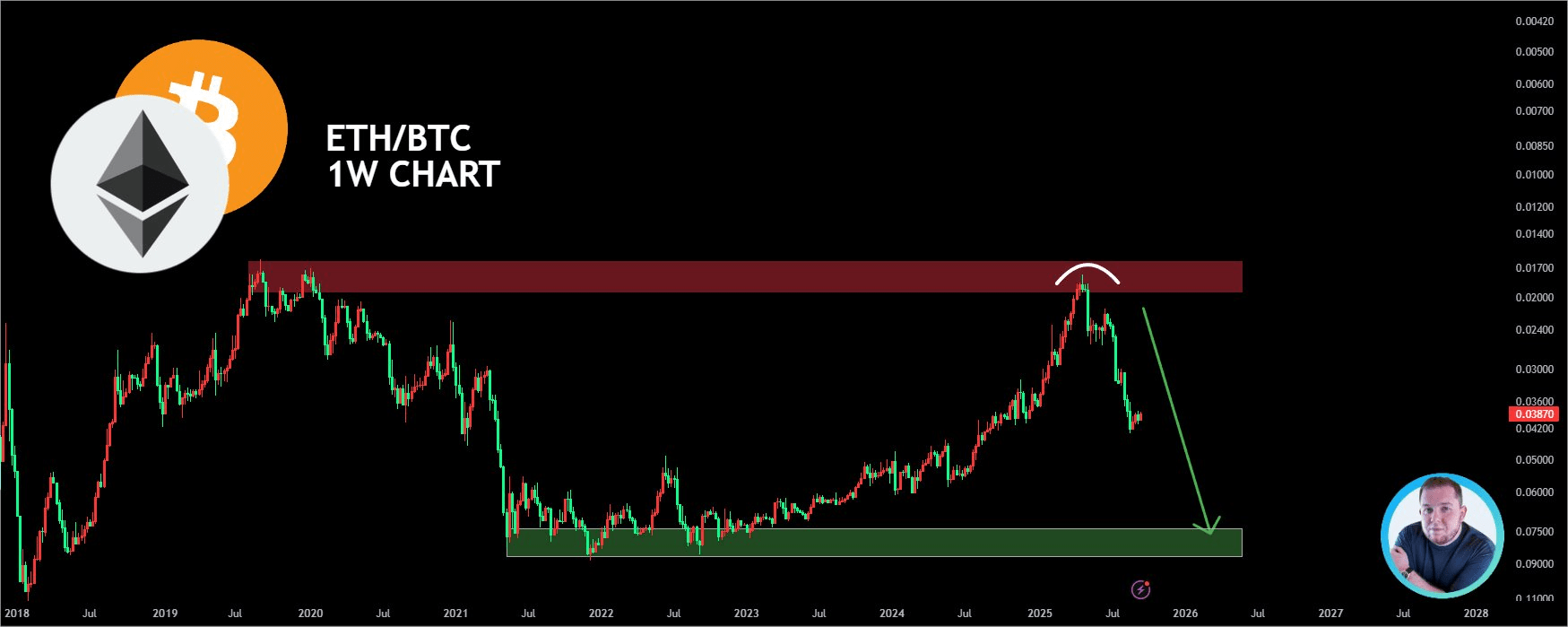 El par ETH/BTC ha mostrado una clara debilidad después de rechazar la zona de resistencia de 0.017–0.021. Una formación de techo redondeado ha desencadenado una fuerte tendencia a la baja, señalando que ETH está perdiendo terreno frente a Bitcoin.