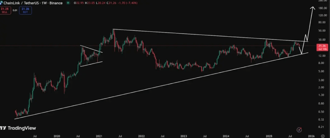 Chainlink está una vez más en el centro de atención a medida que nuevas asociaciones fortalecen su credibilidad institucional. Las últimas noticias de Chainlink destacan su papel como un “súper validador” en la red Canton, una blockchain respaldada por gigantes como Microsoft y Goldman Sachs. A pesar de que el precio de LINK hoy se mantiene cerca de $21.8, los analistas ven una ruptura en proceso.