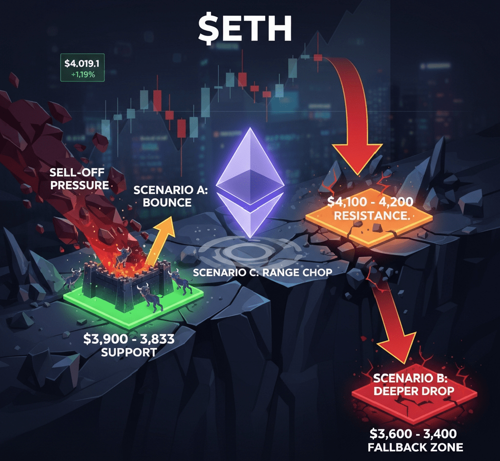 Vemos 3 escenarios principales para $ETH a continuación: Un Rebote Defensivo - "Mantener & Cambiar" Condición: se mantiene $3,833. Ruta: Rebote a la resistencia de $4,100–$4,200. Si eso cambia, el objetivo se convierte en $4,700+. (Mejor Caso)