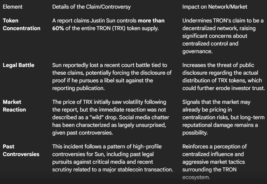El debate sobre la verdadera descentralización de la red TRON (TRX) ha alcanzado un punto álgido tras un importante informe que afirma que el fundador Justin Sun controla más del 60% del suministro de tokens de la red. Esta explosiva alegación, supuestamente basada en datos proporcionados por el propio equipo de Sun, desafía directamente la misión fundamental del proyecto de construir un ecosistema de contratos inteligentes descentralizado.