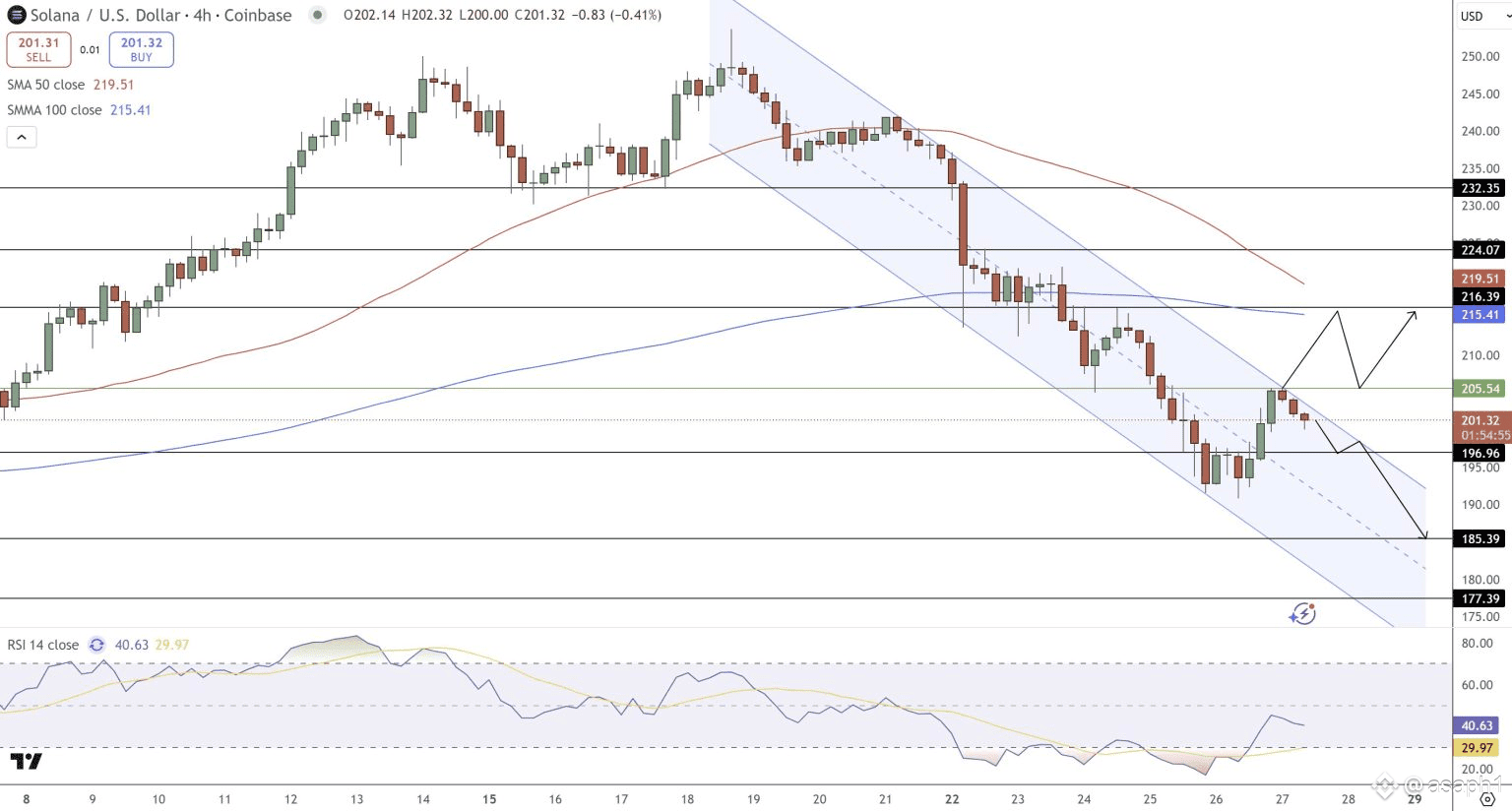 Ahora, la parte donde toca ser honestos: el precio de SOL está luchando. A pesar de todo el hype, técnicamente está en un canal descendente. Hay resistencias duras que no ha podido romper, especialmente alrededor de los $205.50, y más arriba, las medias móviles de $215.40 y $219.50. Es como si una mano invisible estuviera empujando el precio hacia abajo. ✋