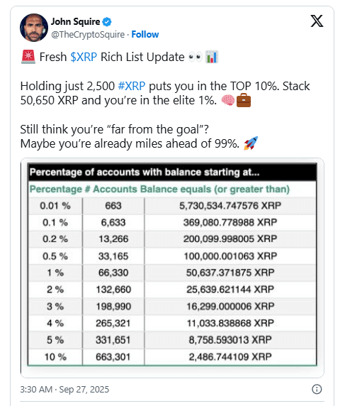 Los datos de Squire refuerzan la concentración de la propiedad de XRP y destacan la oportunidad disponible para los pequeños inversores minoristas. Estar en el 10% superior requiere mucho menos de lo que muchos anticipan, y entrar en el 1% superior requiere tenencias que son alcanzables para un segmento de la comunidad.