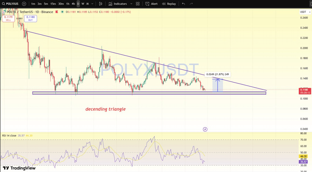 Aquí, puedo ver Polyx en el marco de tiempo diario siguiendo un patrón de gráfico bajista 📉 llamado triángulo descendente. Estoy esperando una caída del 5%, después de lo cual esta moneda puede rebotar desde el área de soporte.