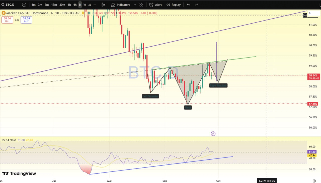 Mientras tanto, la dominancia de BTC está formando un patrón de cabeza y hombros inverso, con el hombro derecho aún en desarrollo. Esto indica la posibilidad de una caída a corto plazo antes del próximo movimiento.
