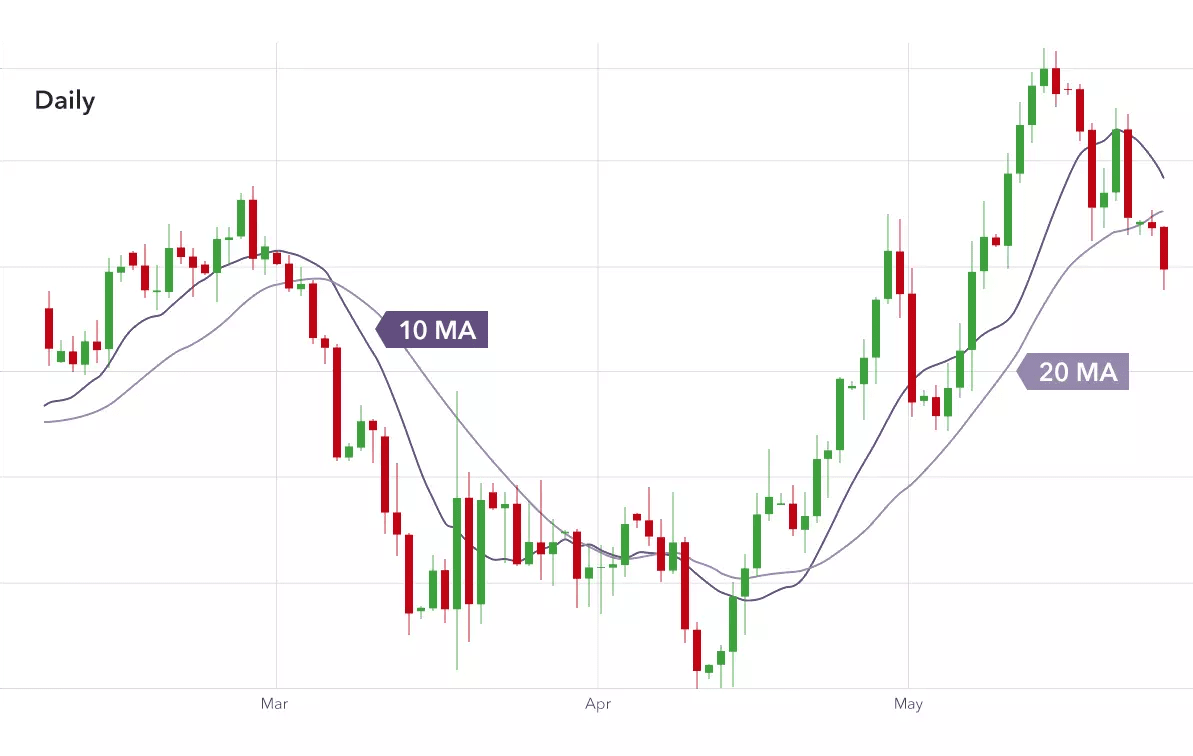 Observa cómo el promedio móvil de 10 períodos parece seguir el precio, pero la línea es más suave y se retrasa algo. Ahora observa qué sucede cuando agregas un MA de 20 períodos al gráfico: