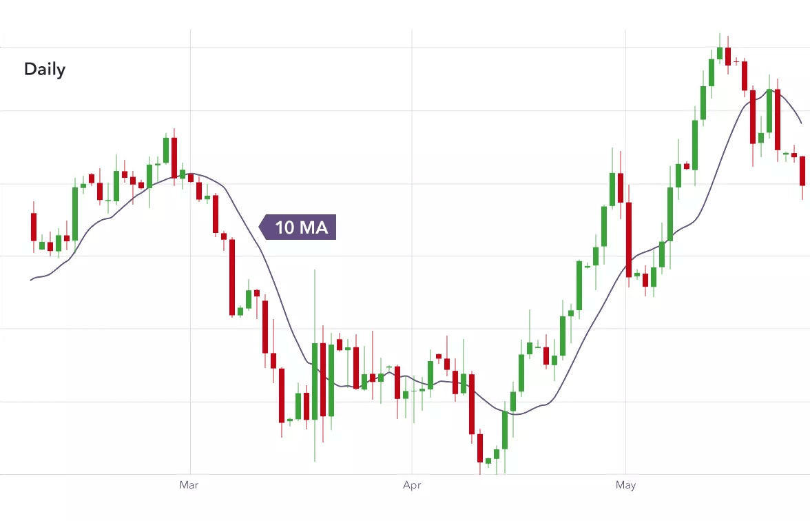 No es sorprendente, dado su nombre, que el promedio móvil simple simplemente grafique el precio promedio de un mercado durante un período de tiempo especificado. Veamos un gráfico diario de GBP/USD con un MA de 10 períodos superpuesto: