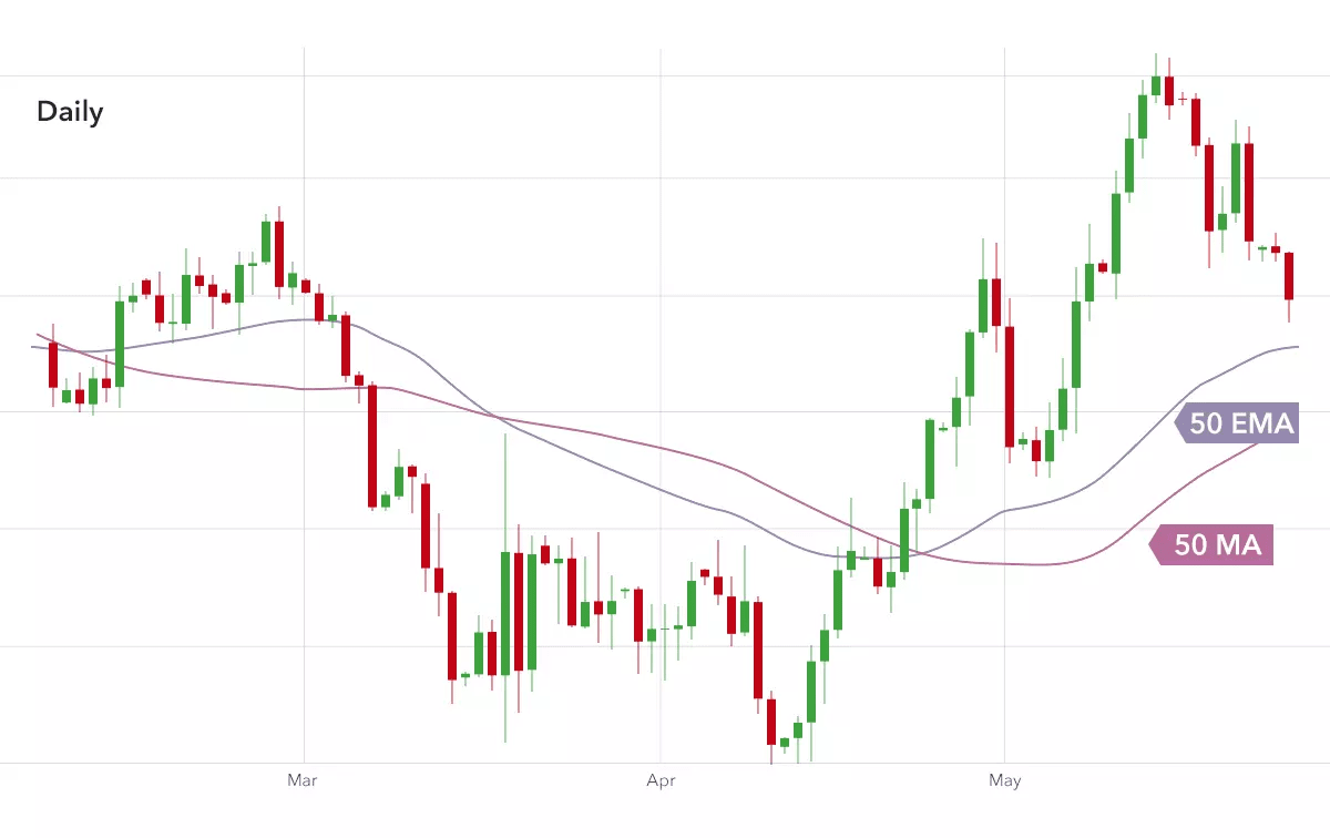 Ahora aquí está la EMA de 50 y la MA de 50: