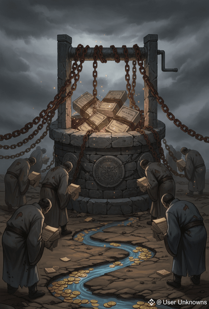 Bayangkan ini: Sebuah lanskap Alam Tradisional yang muram. Sungai yang seharusnya mengalirkan air emas (modal) kini tersumbat oleh tumpukan surat berharga yang terikat rantai birokrasi kuno. Di atas tumpukan itu, beberapa sosok tua berwajah lelah, para perantara dan bank kustodian, berdiri menjaga dengan tatapan kosong. Di tengah sungai, sebuah sumur batu tua yang dipenuhi segel-segel kuno memerangkap gumpalan-gumpalan uang tunai yang memancarkan aura redup, menunjukkan energi yang terhenti dan tidak bergerak.