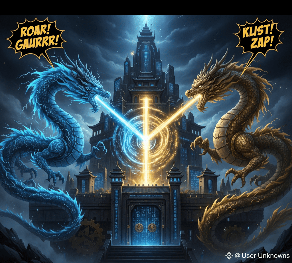 Pandanglah Benteng Langit yang megah, kubu pertahanan utama BounceBit. Di sisi kanan gerbang utamanya, bersemayam seekor Naga Batu Emas Raksasa (melambangkan Bitcoin/BBTC), memancarkan aura bobot dan stabilitas yang tak tergoyahkan, seolah menjadi jangkar bagi seluruh benteng. Di sisi kiri, seekor Naga Listrik Biru (melambangkan BB Token) yang ramping dan gesit terbang mengelilingi benteng, memancarkan percikan energi, menjaga batas-batas dan memproses informasi dengan kecepatan kilat. Kedua naga ini, satu kokoh dan satu lincah, membentuk pertahanan yang sempurna.