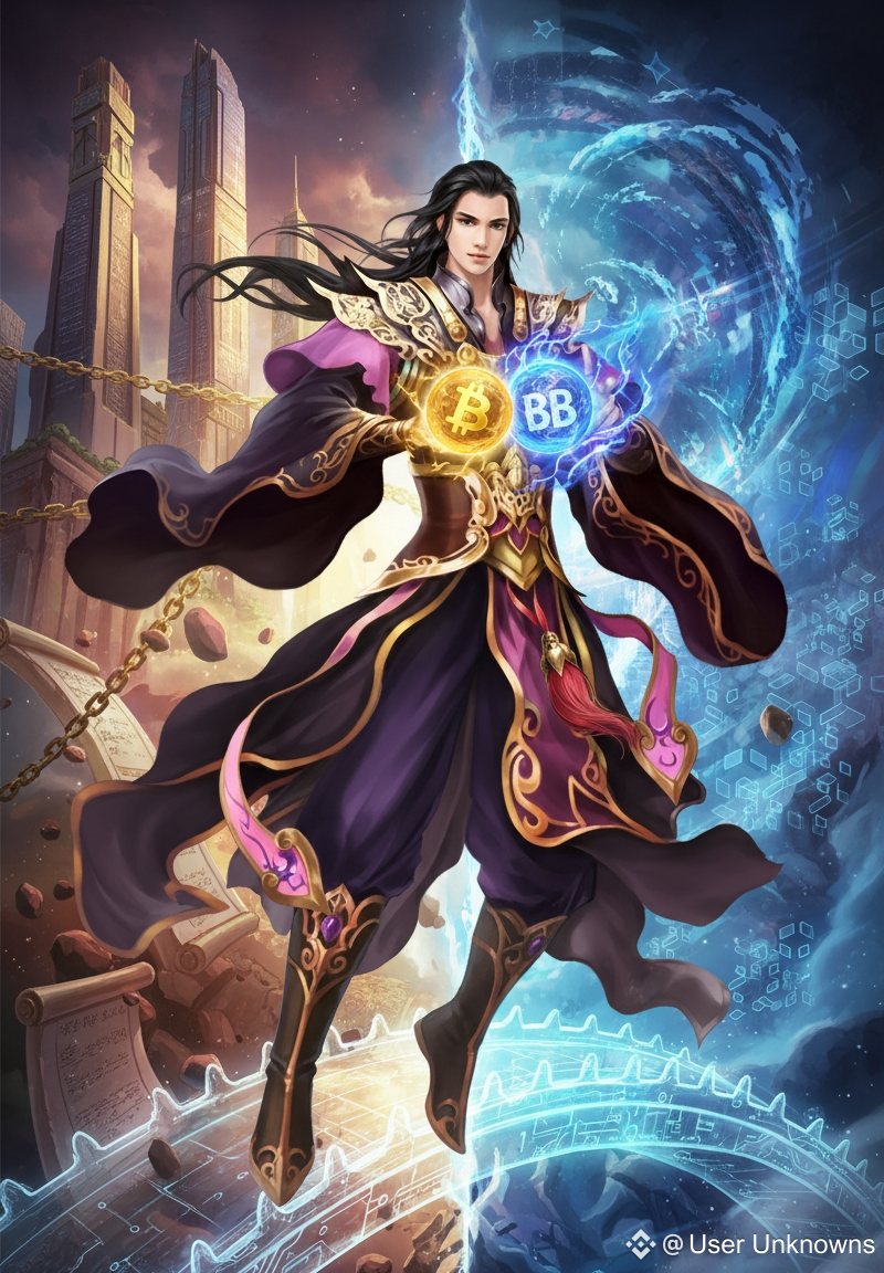 Terlihat di hadapanmu adalah sampul utama, sebuah mahakarya yang membelah pandangan. Di sisi kiri, sebuah alam kokoh berwarna emas dan abu-abu, dengan siluet gedung-gedung pencakar langit menjulang tinggi—ini adalah Alam Tradisional. Di sisi kanan, sebuah lautan energi biru elektrik dan ungu yang bergelora, dipenuhi pola sirkuit dan aliran data—ini adalah Alam Web3 yang dinamis. Melintang megah di antara keduanya adalah sebuah Jembatan Naga/Naga Listrik bercahaya, terbuat dari energi benderang dan simbol-simbol blockchain yang berkedip. Di tengah jembatan itu, berdiri sosok "Sang Konektor," perwujudan BounceBit. Jubah megahnya memadukan kemewahan kuno dengan teknologi masa depan, dan di tangannya tergenggam "Segel Ganda" yang memancarkan aura emas Bitcoin dan biru-ungu BB Token. Di bawahnya, koin emas besar dan gulungan obligasi di sisi tradisional mulai bertransformasi menjadi token, sementara simbol Bitcoin dan Stablecoin berputar-putar di sisi Web3. Ini adalah permulaan dari sebuah epos!